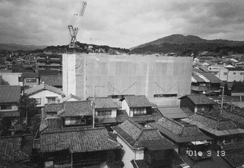 | 2階建ての木造家屋が並ぶ町内に、巨大なスケールのマンションが姿を現わしている。住民にとっては、京都駅ビルに匹敵するものに思える。そしてここが活断層の真上なのです。 |