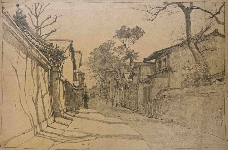 描いた画家は昭和前期、関西洋画壇の重鎮として活躍した洋画家の黒田重太郎。1997(明治20)年、大阪船場の豪商「秩父屋」の分家の長男として現在の滋賀県大津市に生まれた黒田重太郎は、船場に戻った両親のもとで幼少時を過ごした。小学校卒業後、東京の慶応義塾普通部在学中に画家を志すが反対され帰阪を強いられた。が、画家になる夢を捨て去ることは出来ずにいた。親同士が懇意であった洋画家の河合新蔵の紹介により、1904(明治37)年5月頃、京都市室町通丸太町上る西側にヨーロッパ留学から帰国して画塾を開いたばかりの鹿子木孟郎に入門した。無駄のない一本の線描を大切にする鹿子木の指導を受け、黒田は連日の市中写生行脚に出かけた。