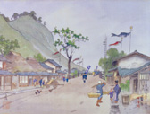 今から100年前の1921(大正21)に完成した『東海道五十三次絵』画冊は、全てが日本画の顔料で絹本に描かれています。広重の代表作『東海道五十三次』(1834年・保永堂版)とほぼ同じ場所と構図を求めて河合が写生旅行して描いた真景図です。
