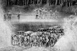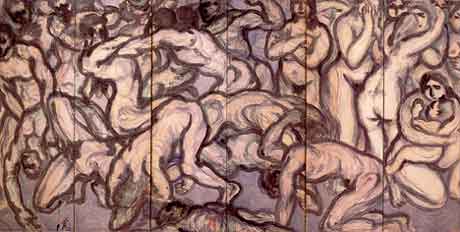 | 本展では93年振りに新発見された<戦へる人>のお披露目を兼ね,所蔵の群像作品を一堂に展観するものです。明治時代の温泉場の女人風俗、農漁業に従事する農家の人々、春秋の祭りに集う人々、天正使節のヴァチカンへの行列とヴェニスでの歓迎の祭り、水浴の裸女群像、子供達の遊戯や斉唱の様子、人形たちの福寿祈願群像、竹林七賢人図、相撲場や水泳場の群像、彼岸と此岸を主題にした群像、闘い、鳥の群れなど、本展で用意している群像作品の主題を列記してみました。 もともと「群像」は多くの人々がそれぞれに生き生きと活躍している姿を指すとして、「青春の群像」とかの使い方もされますが、絵画や彫刻の中で、多くの人物の集合的構成を表現したもので、美術の世界に独特の表現の仕方です。表現は相対的に作品の大きさが必要となるため、当画廊でもあまり展示してきなかった屏風(六曲、四曲、二曲)が6点、油絵も30号以上の絵がほとんどとなります。 残念なことに画廊の空間という制約があるので、展示替えをしても全作品を一堂に並べることは不可能となります。せめて全貌を紹介できるものとして、展覧会図録には全作品をカラー図版で解説文と共に紹介しています。資料として各作家の経歴も詳しく掲載することにしました。ご利用頂ければ幸いです。 |